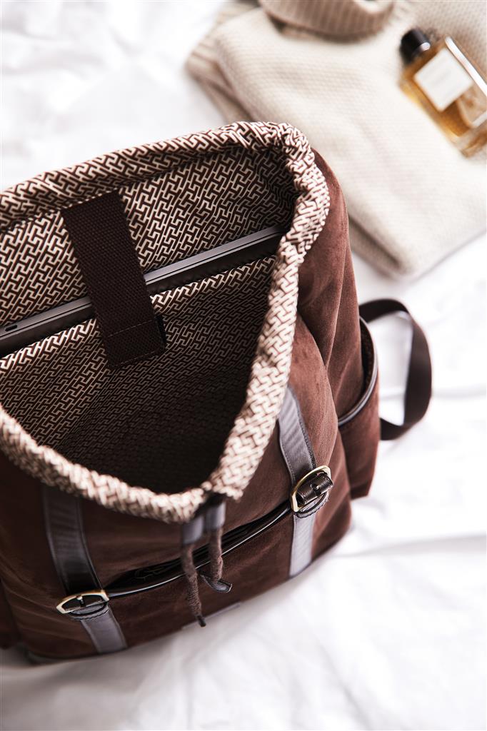 Ексклузивна раница в класически дизайн. Изработена от фина имитация на велур, с месингови детайли. Функционалността, съчетана със стилен дизайн, прави тази раница идеална както за работа, така и за свободното време. Снабдена с джоб за лаптопи до 17”. Размери: 30.5 x 10 x 49 см.