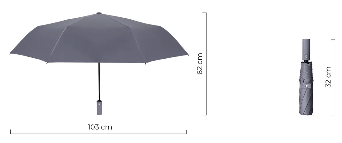 Сгъваем ветроустойчив чадър с функция за автоматично отваряне/затваряне. 8 панела, рамка от метал и фибростъкло, черно метално рамо (Ø 11 мм), метални накрайници, черна гумирана дръжка, торбичка от същата материя като на чадъра. Размери: Ø103 x 62 (32) см.