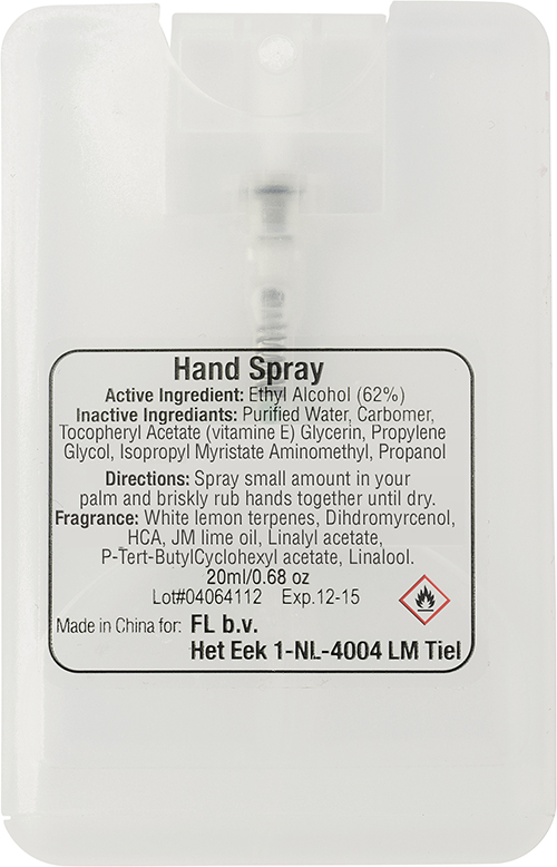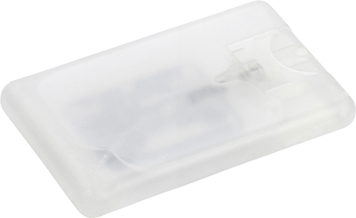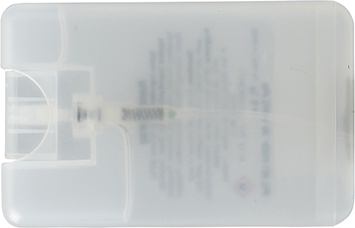 Спрей за дезинфекция във формата на кредитна карта (20 мл). Размери: 8.6 x 5.6 x 1.1 см.