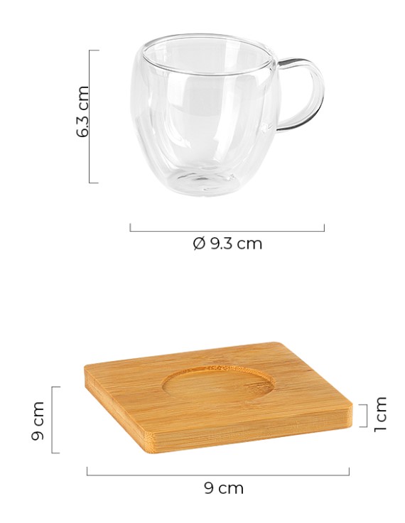 Комплект от две чаши с поставки от бамбук. Изработени от двустенно боросиликатно стъкло. Вместимост: 90 мл.