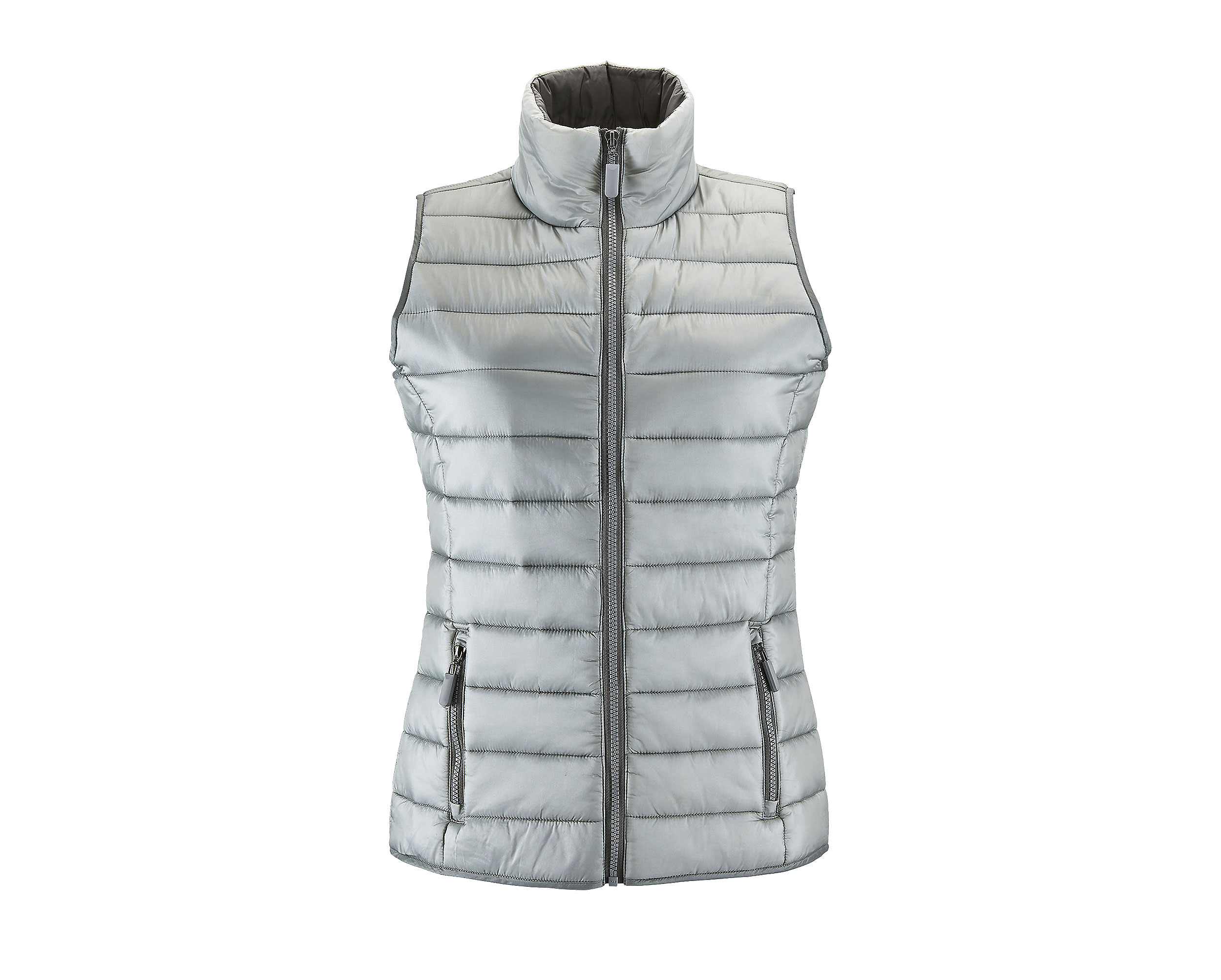 Лек дамски елек с цип. Два предни джоба с цип, полиестерен пълнеж.