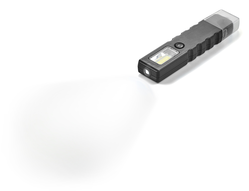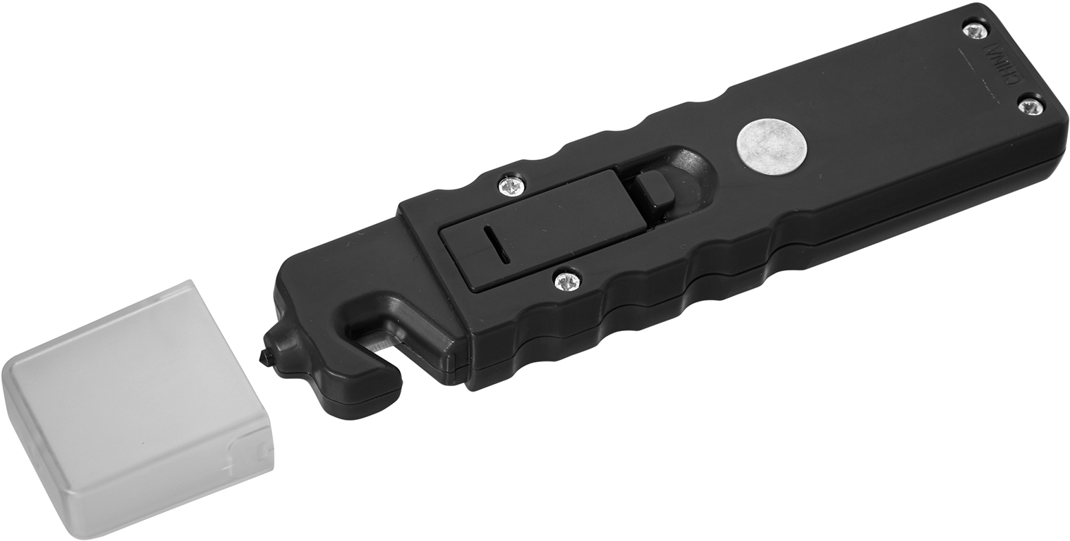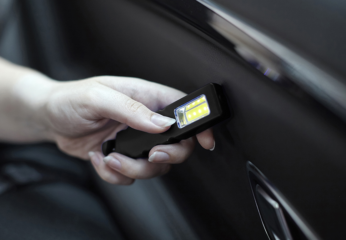 3 в 1 мулти инструмент за безопасност: COB фенер с 4 LED крушки (с опция за мигаща светлина), накрайник за чупене на стъкло, нож за предпазен колан. Включен магнит. Включени батерии. В индивидуално пликче. Размери: 12.4 x 2.5 x 1.9 см.