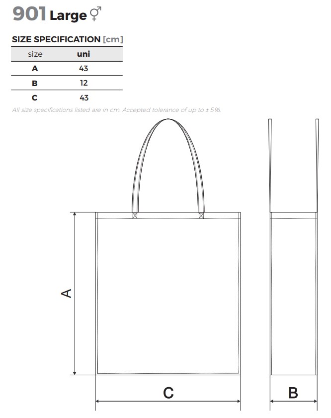 Пазарска торба с дълги дръжки. Размери: 43 x 43 x 12 cm; размери на дръжките: 70 x 2,5 cm.
