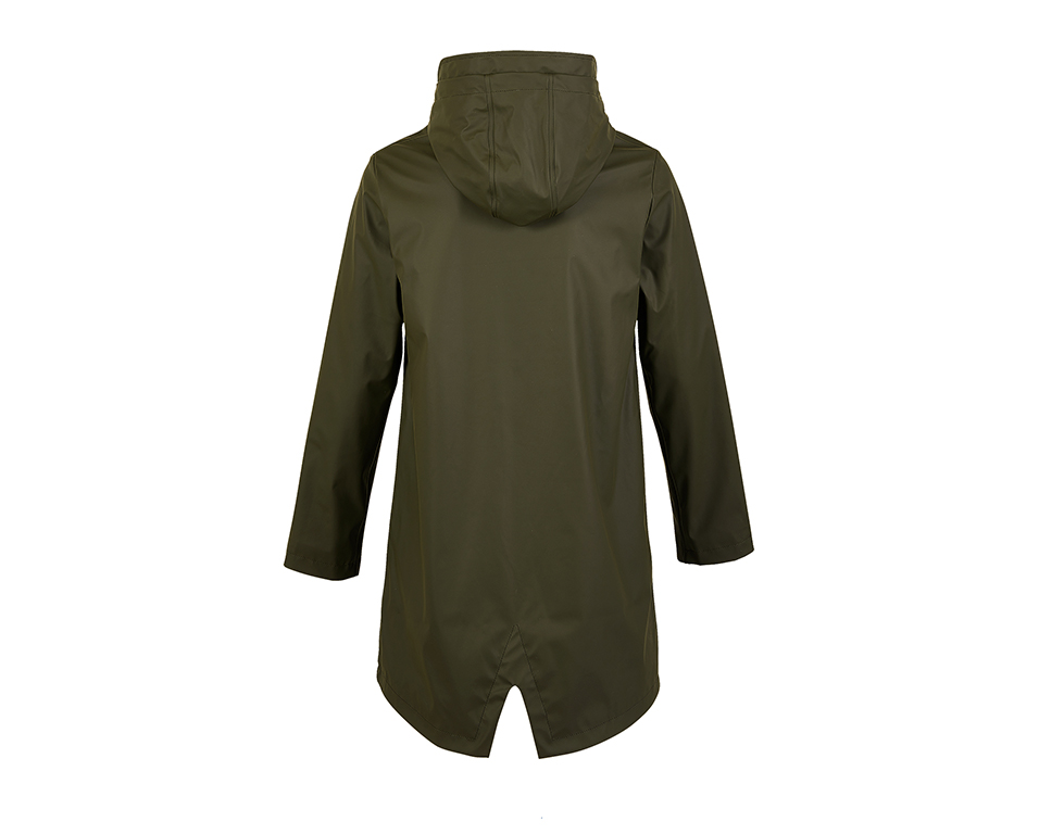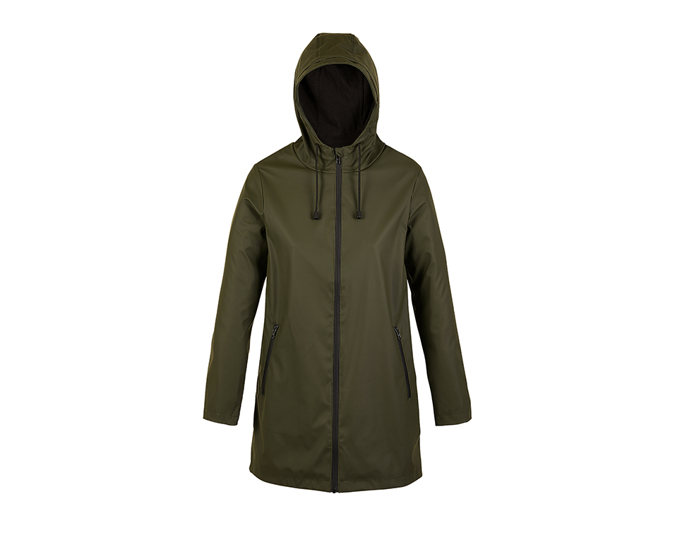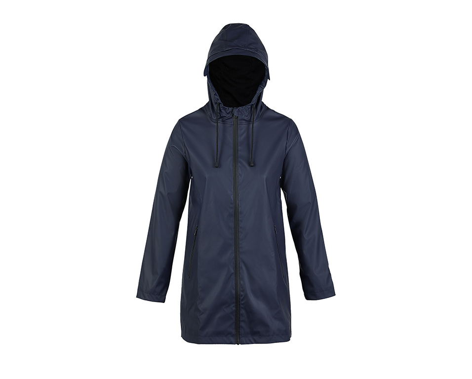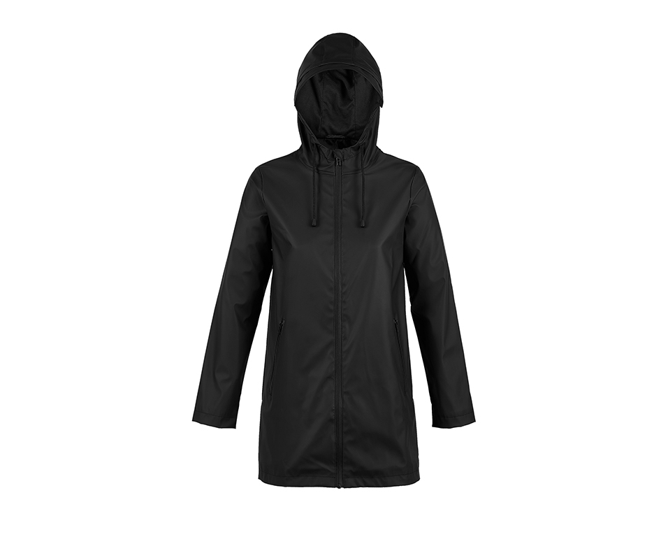 Дамско водоустойчиво яке с качулка. С PU покритие. Водоустойчиво (5000 мм воден стълб). Качулка с корда. Два джоба с водоустойчиви ципове. Шлиц на гърба. Запечатани шевове.