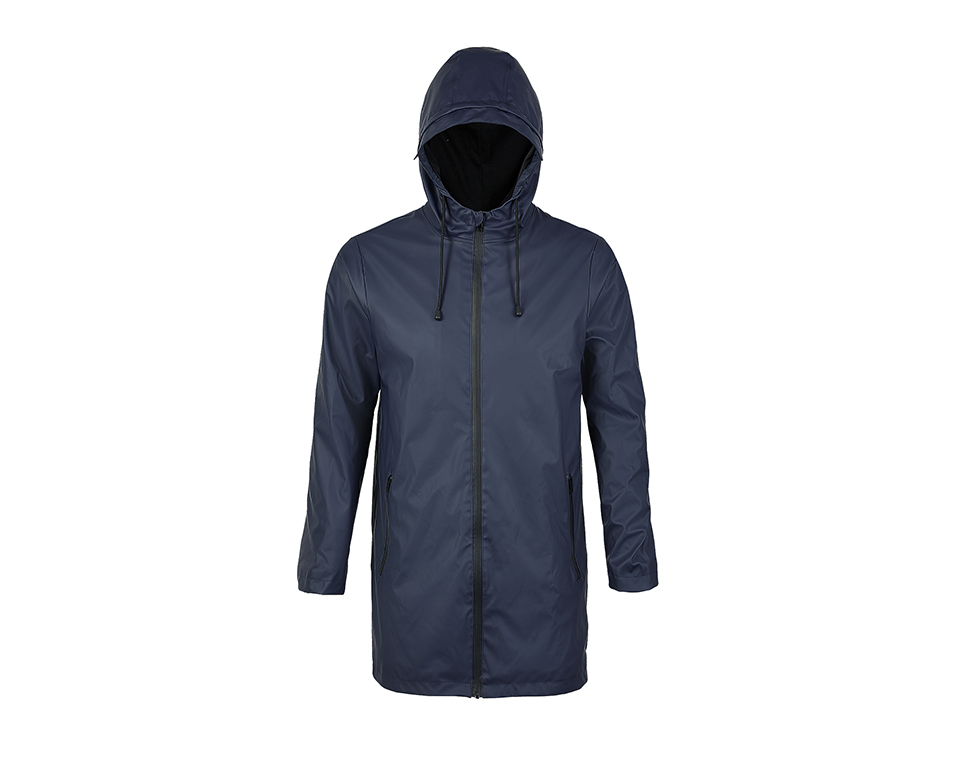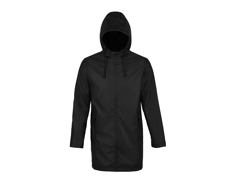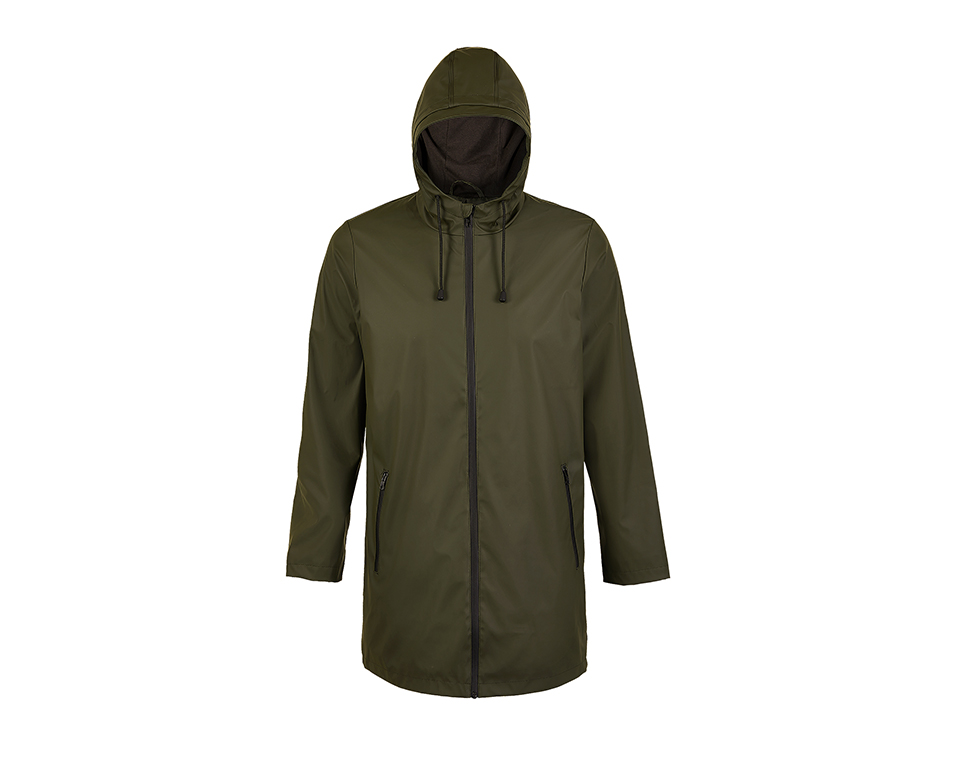 Мъжко водоустойчиво яке с качулка. С PU покритие. Водоустойчиво (5000 мм воден стълб). Качулка с корда. Два джоба с водоустойчиви ципове. Шлиц на гърба. Запечатани шевове.