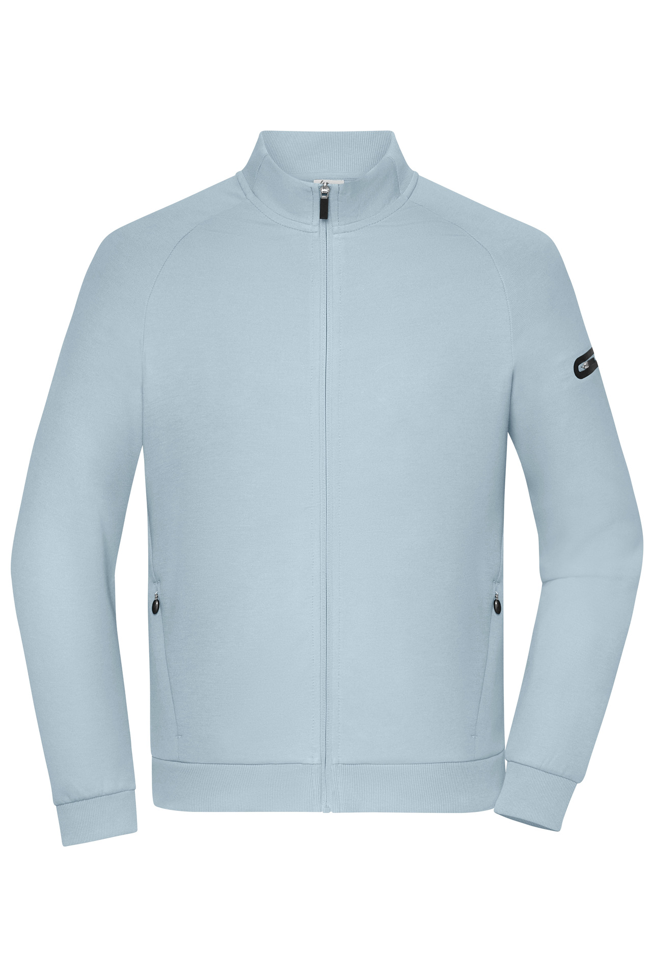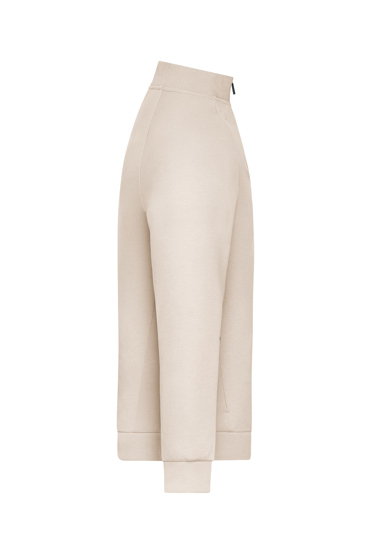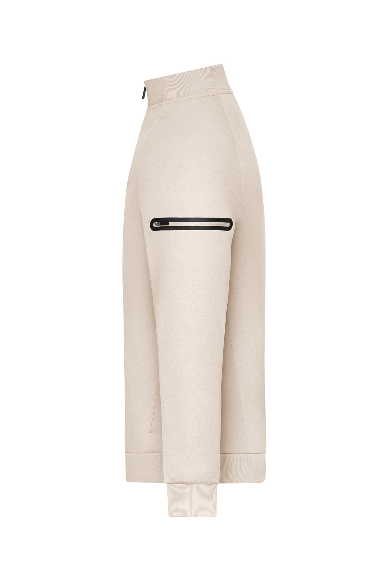 Висококачествена интерлок материя. Удобна комбинация от органичен памук, рециклиран полиестер и еластан. Вдигната яка, цип по цялата дължина на лицето. Джоб с цип на левия ръкав, два странични джоба с цип. Еластични маншети и ханш.