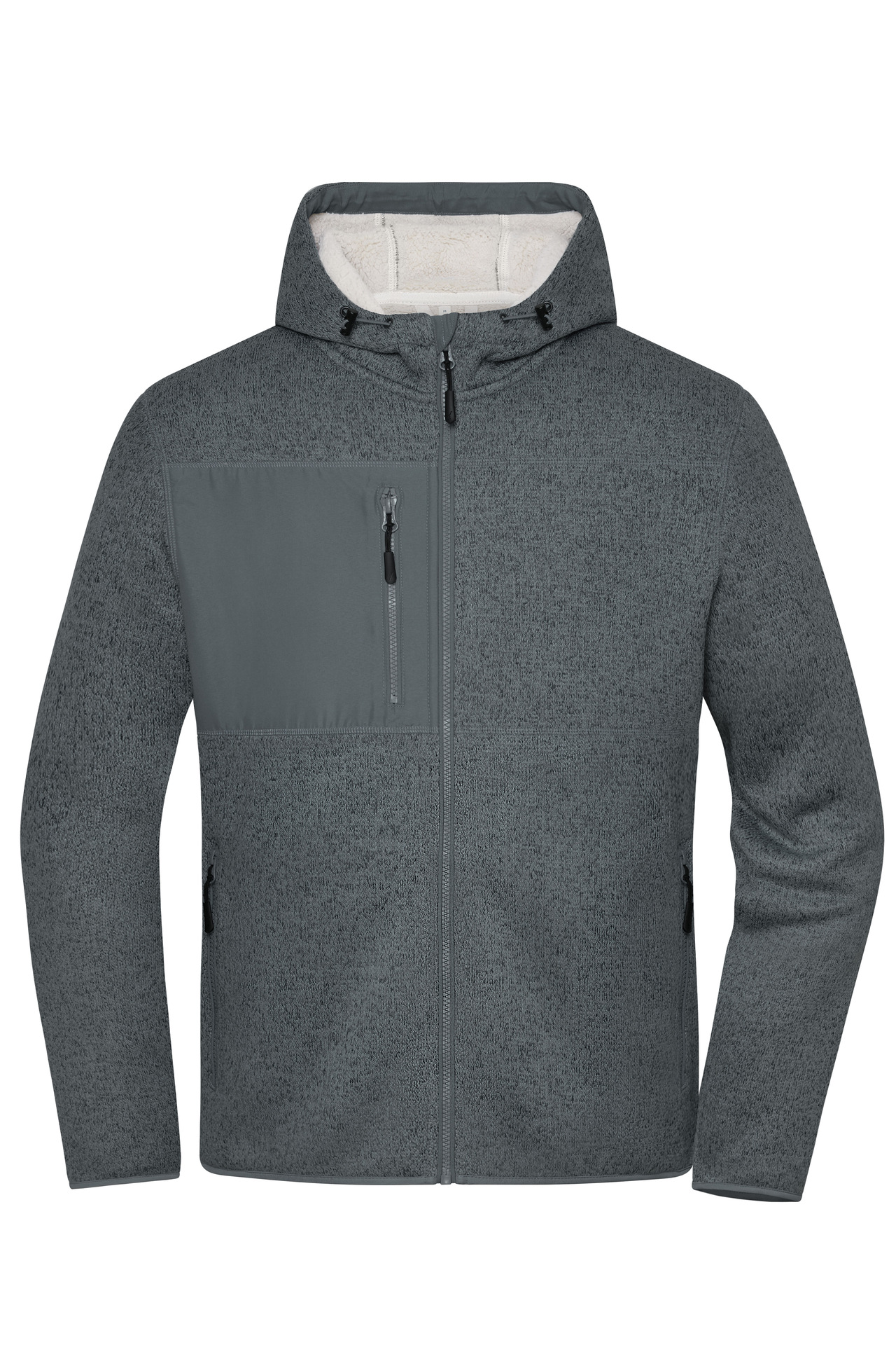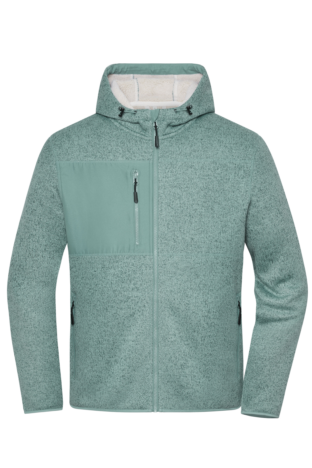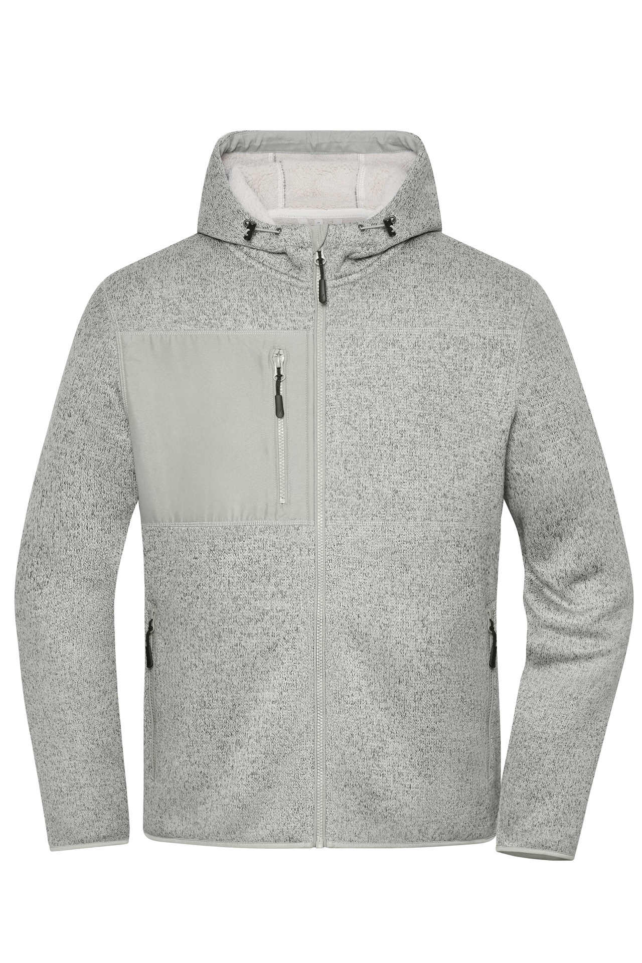 Мека, топла меланжирана материя. Плетена визия отвън, пухкав шерпа полар отвътре. Зашита и регулируема качулка. Контрастна тъкана подплата от вътрешната страна на отвора на качулката. Два странични джоба с ципове, един джоб на гърдите, изработен от контрастна материя и с цип. Два големи вътрешни джоба. Цип по цялата дължина, с предпазител за брадичката. Контрастен кант на всички ципове. Ципове: YKK.