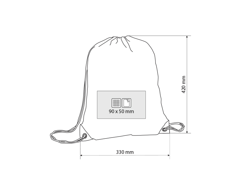 Раница тип мешка с подсилени ъгли и метални капси на отворите. Регулируеми презрамки. Размери: 33 x 42 cм.