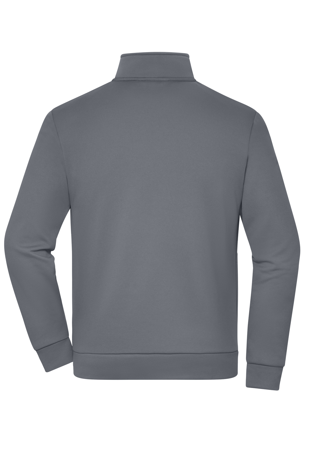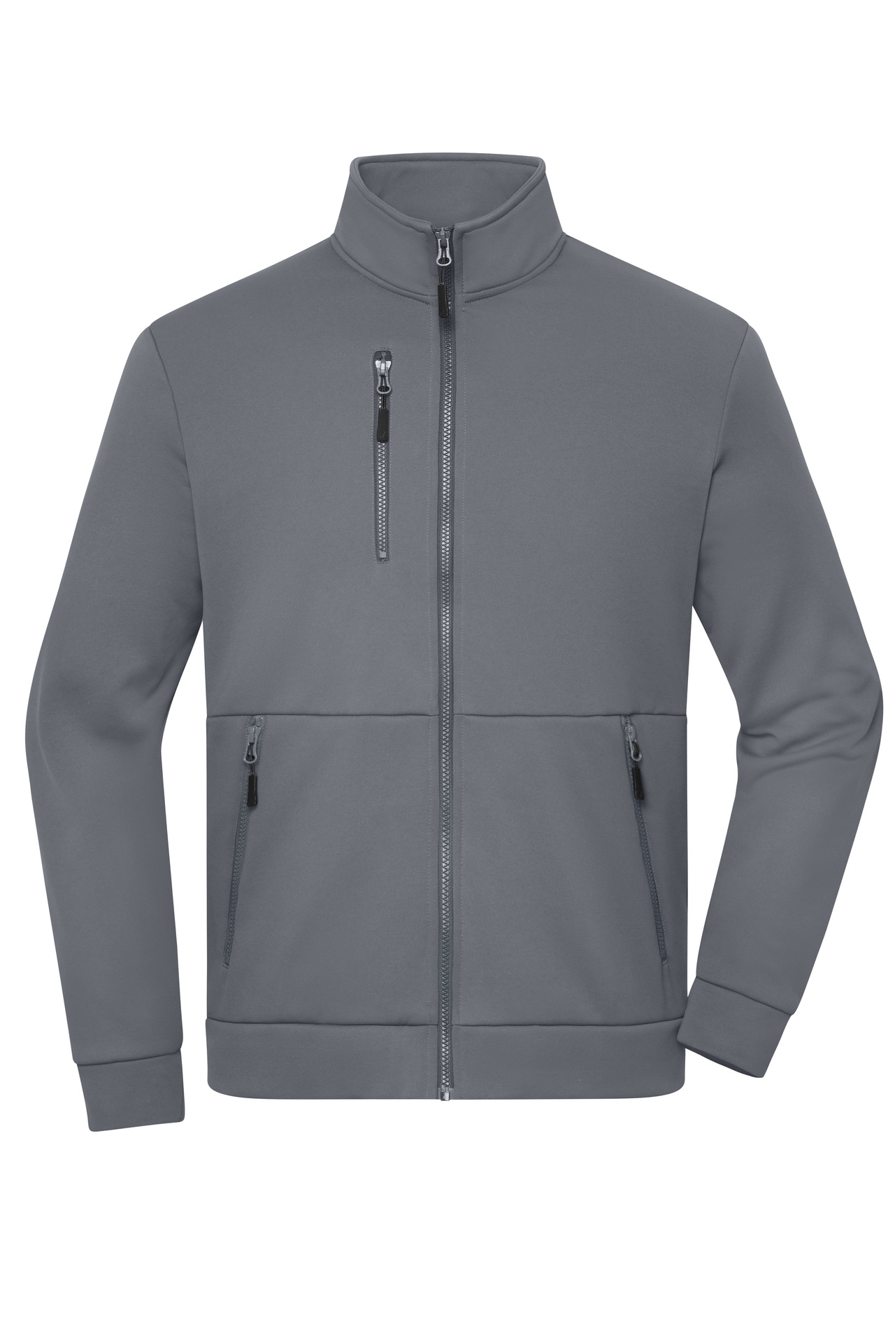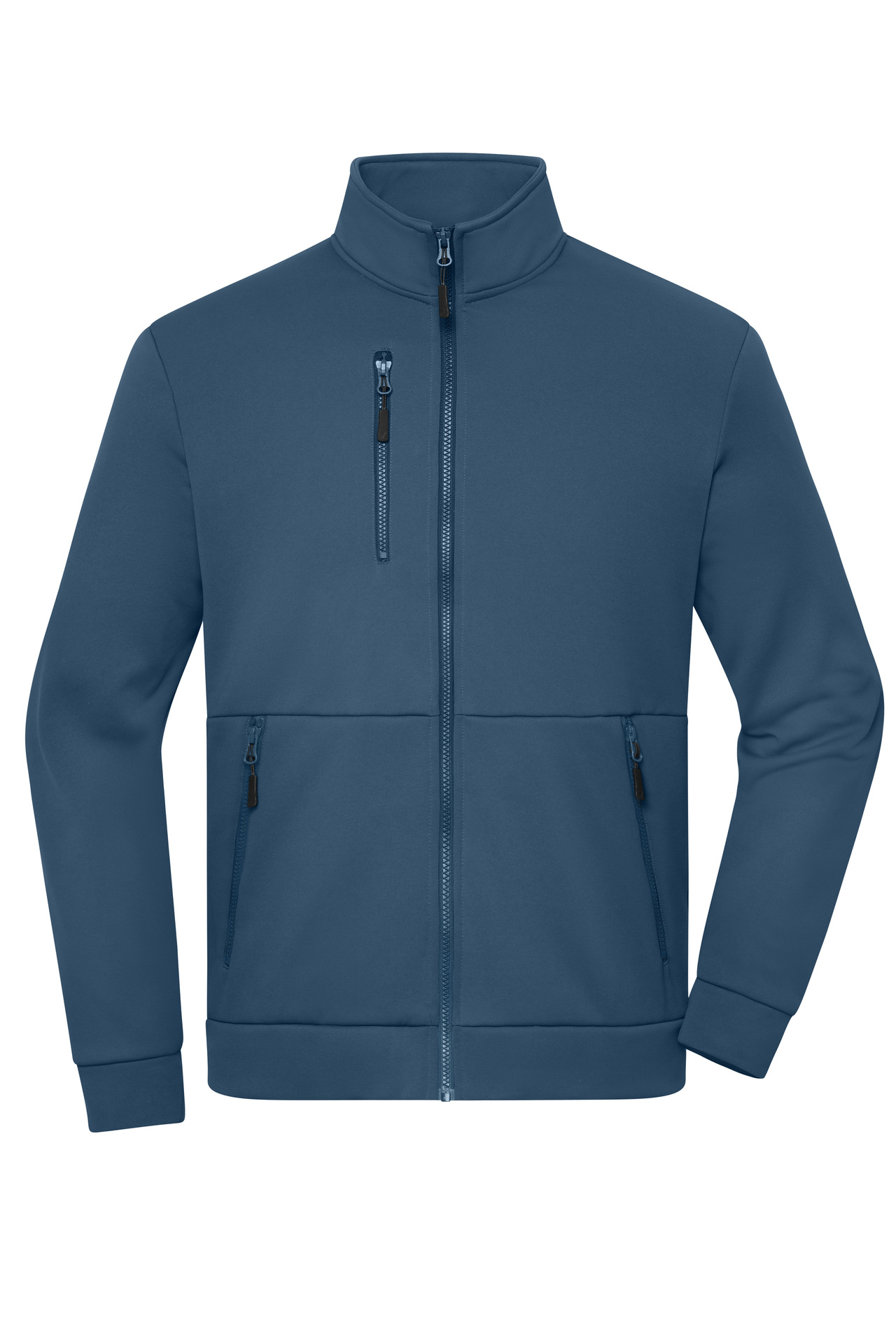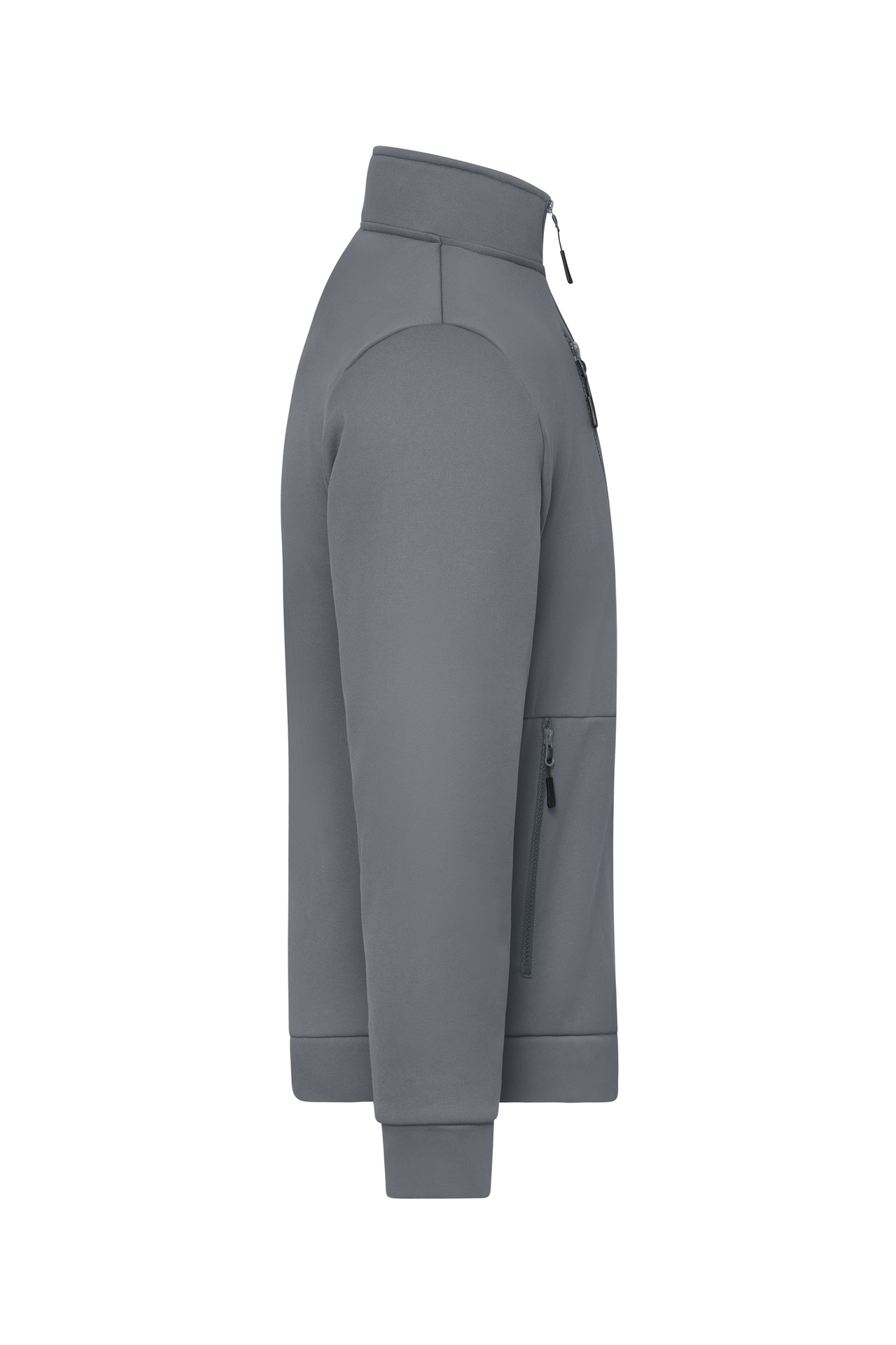 Мек, еластичен материал с гладка външна част и полар отвътре. Материалът съдържа 21% Sorona. Ластичен колан и маншети. Два странични джоба с цип. Един джоб с цип на гърдите. Ципове: YKK.