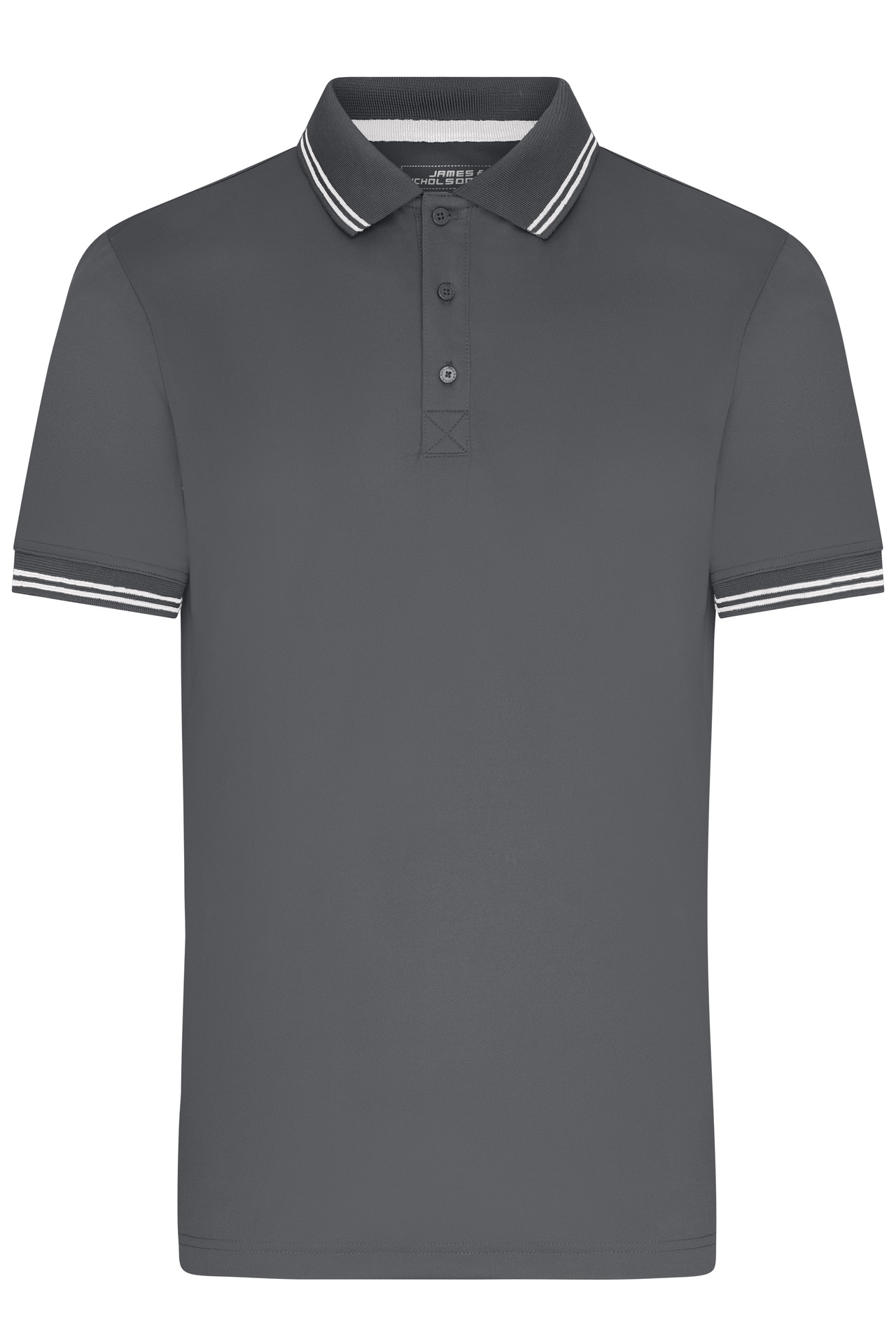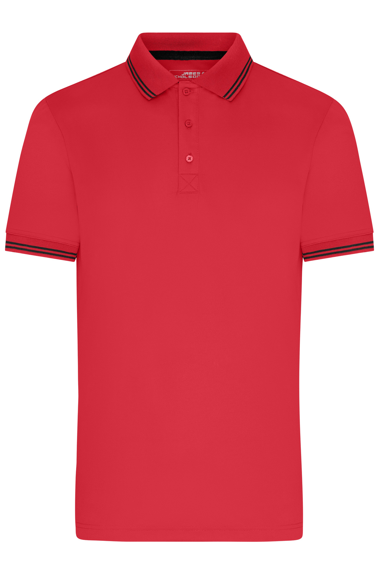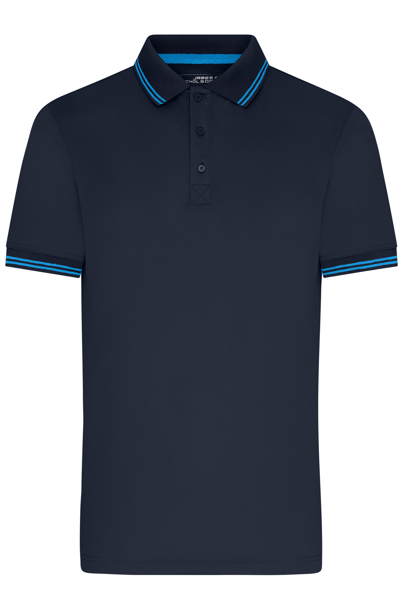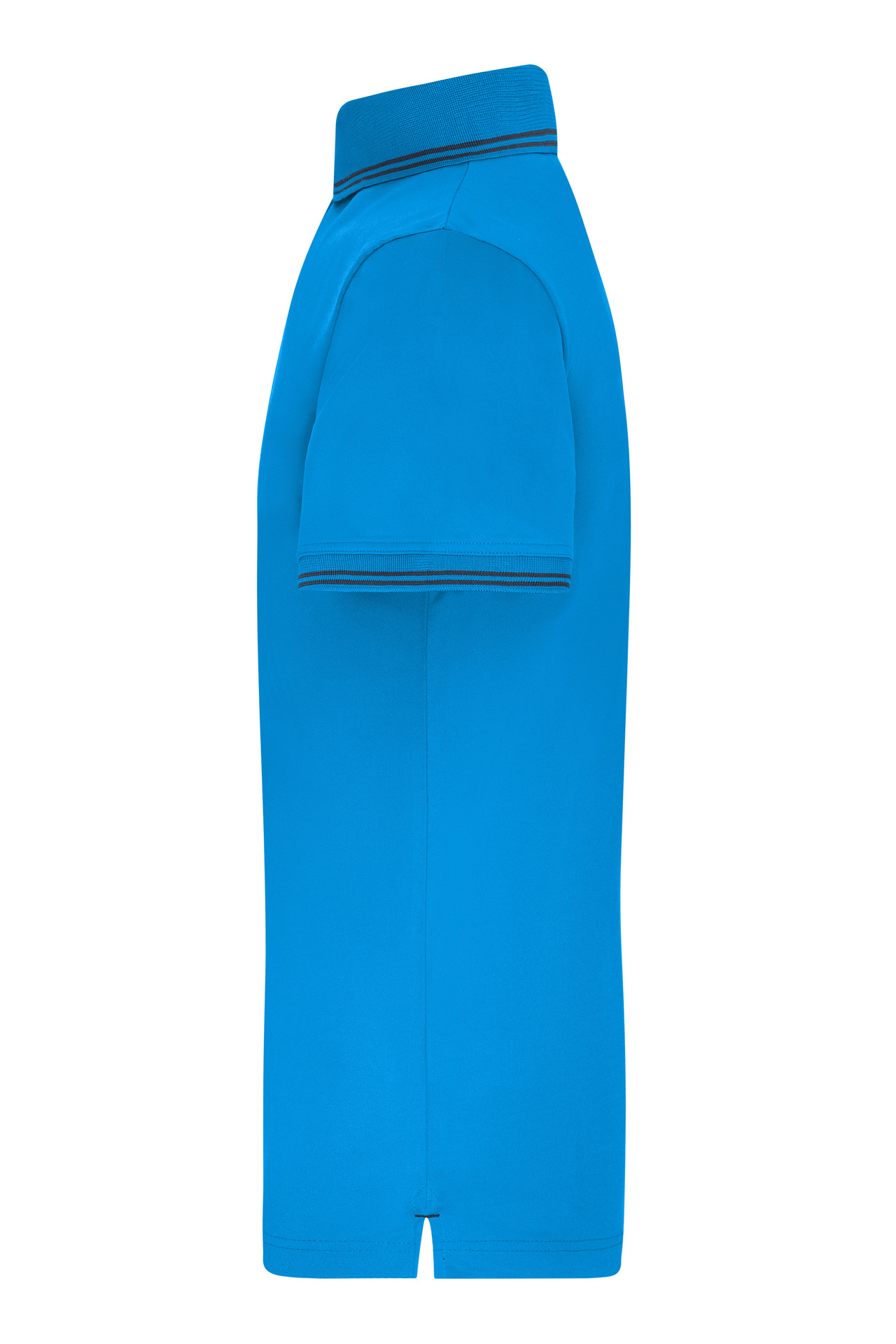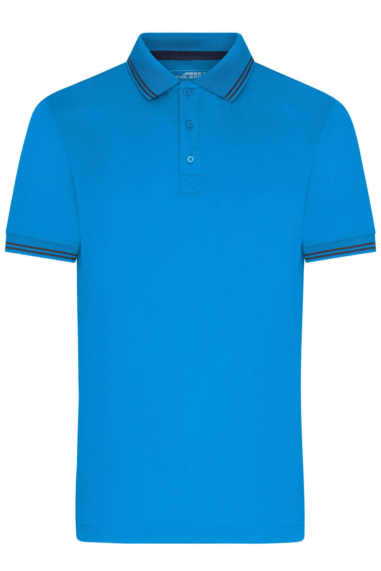 Полиестерна тениска поло с лесна поддръжк. Дишаща и влагорегулираща материя. Яка и маншети с контрастни елементи. Пет копчета.