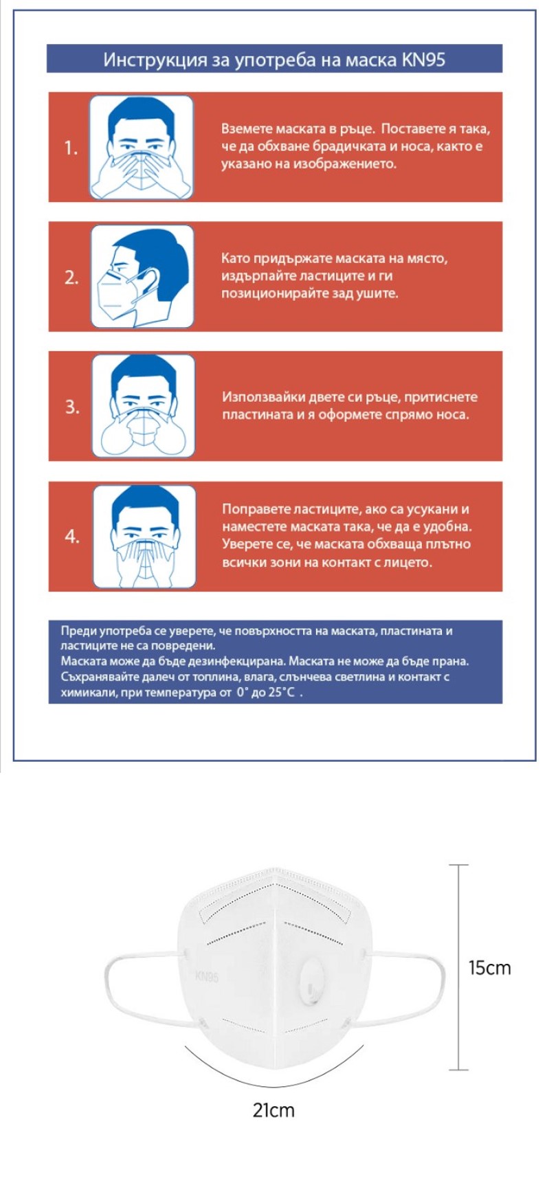 5-пластова маска. 1/2/4/5 слой :бял, Spunbond nonwoven; 3-ти слой : бял Meltblown nonwoven. Метална пластина на носа за по-добро прилягане. Размер на маската 21 х 15 см. Всяка маска е индивдуално опакована. Високо ниво на филтрация /PМ2.5/ PFE> 95% BFE> 95%